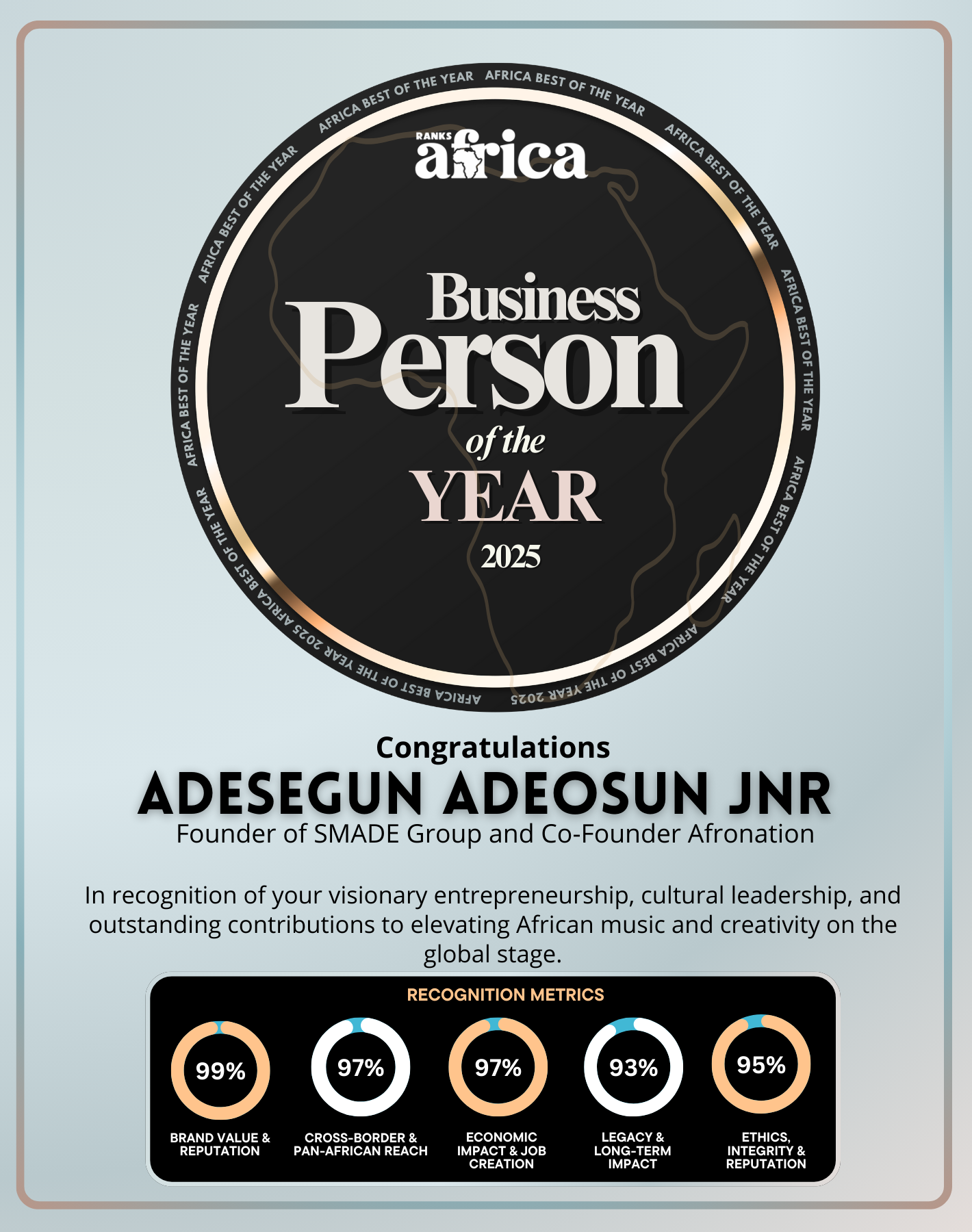 Adesegun Adeosun, popularly known as SMADE, Founder of SMADE Group and Co-Founder of AfroNation, has been named Business Person of the Year 2025 by Ranks Africa, emerging from an elite pool of over 100,000 African entrepreneurs across the continent and diaspora. This recognition celebrates visionary entrepreneurship, cultural leadership, and sustained global impact.