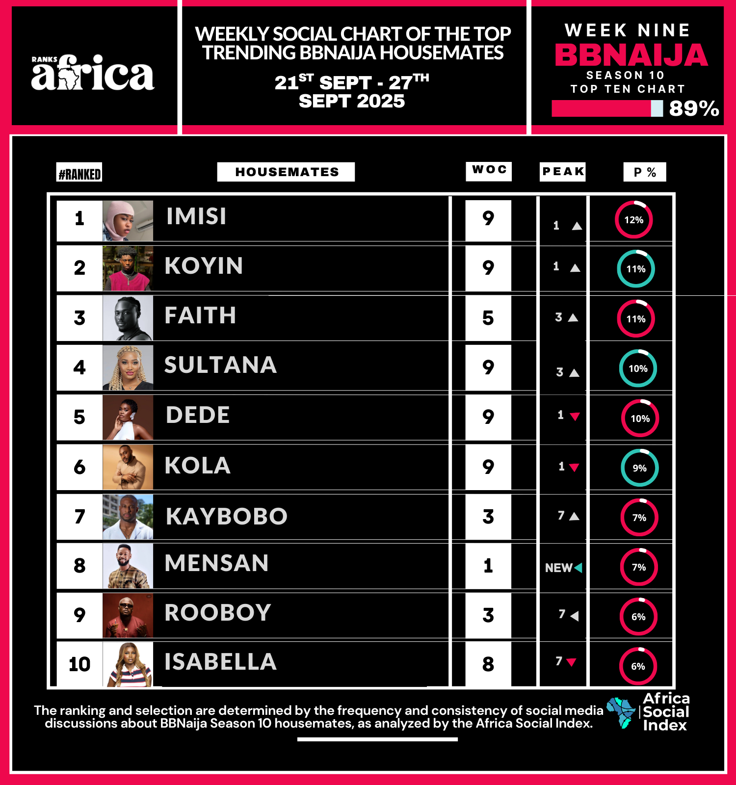 Also making waves on the Week 9 chart are Kaybobo (returning strong), Mensan (entering the chart for the first time), Rooboy (making a solid comeback), and Isabella—all keeping conversations alive as some of the most talked-about housemates across Africa.