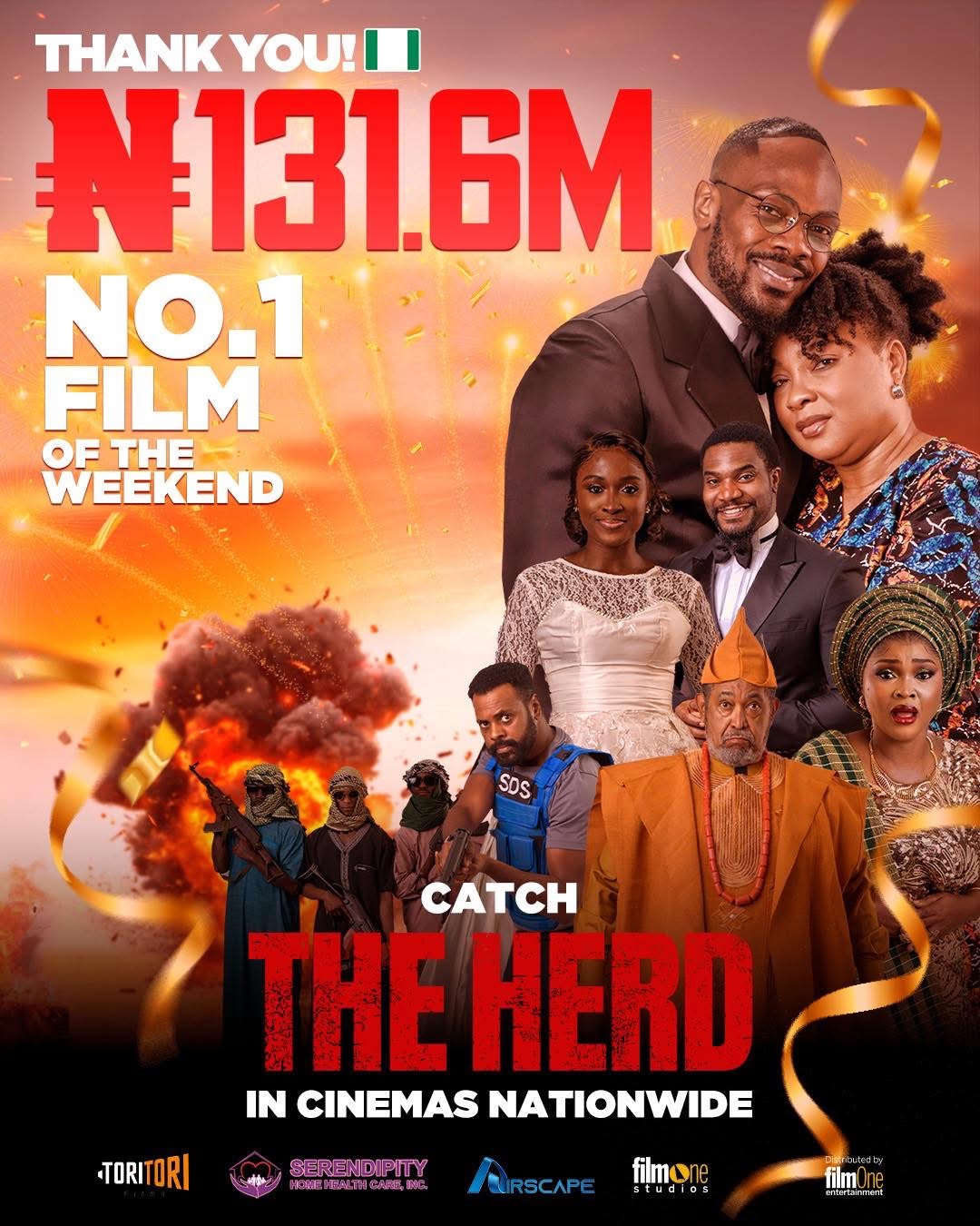 The celebrated actor-turned-director has achieved a major industry milestone with his feature film, The Herd, which dominated cinemas nationwide to become Nigeria’s number one movie, grossing an impressive ₦131.6 million in its debut weekend.