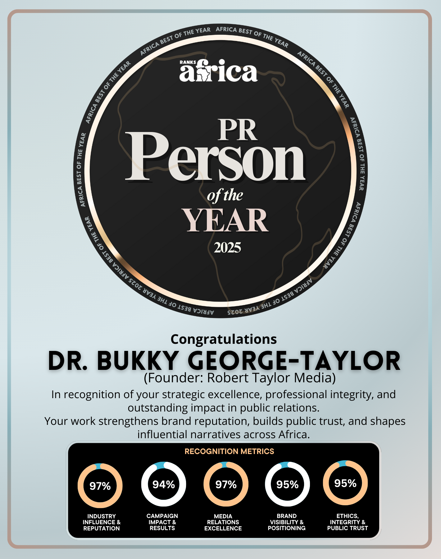 Dr. Bukky George-Taylor, Founder and CEO of Robert Taylor Media, has been officially named Africa’s PR Person of the Year 2025 by Ranks Africa, in the inaugural edition of the Africa Best of the Year Honors in recognition of her outstanding influence, ethical leadership, and transformative impact on the public relations industry across the continent.