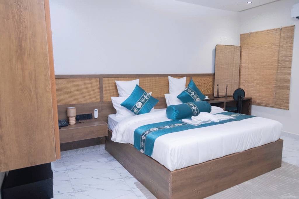The Premier Room, priced at ₦185,000 per night, offers upgraded furnishings, premium bedding, and enhanced amenities for guests seeking a more elevated stay.  A king-size bed replaces the standard option. A mini bar is added. Tea and coffee-making facilities are included, along with premium toiletries and a work desk.