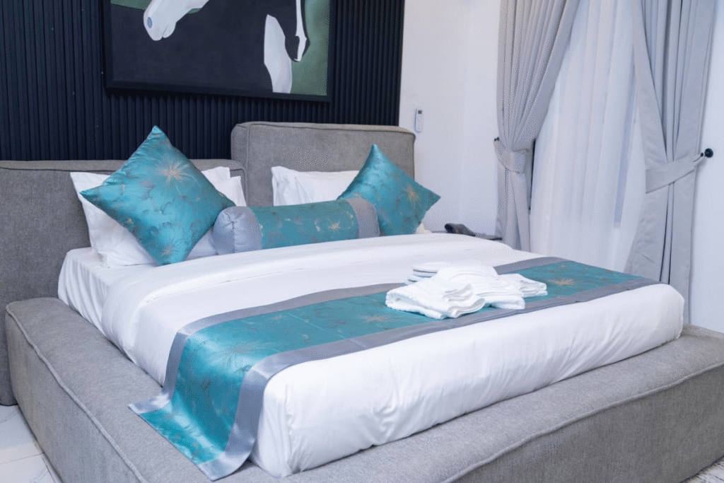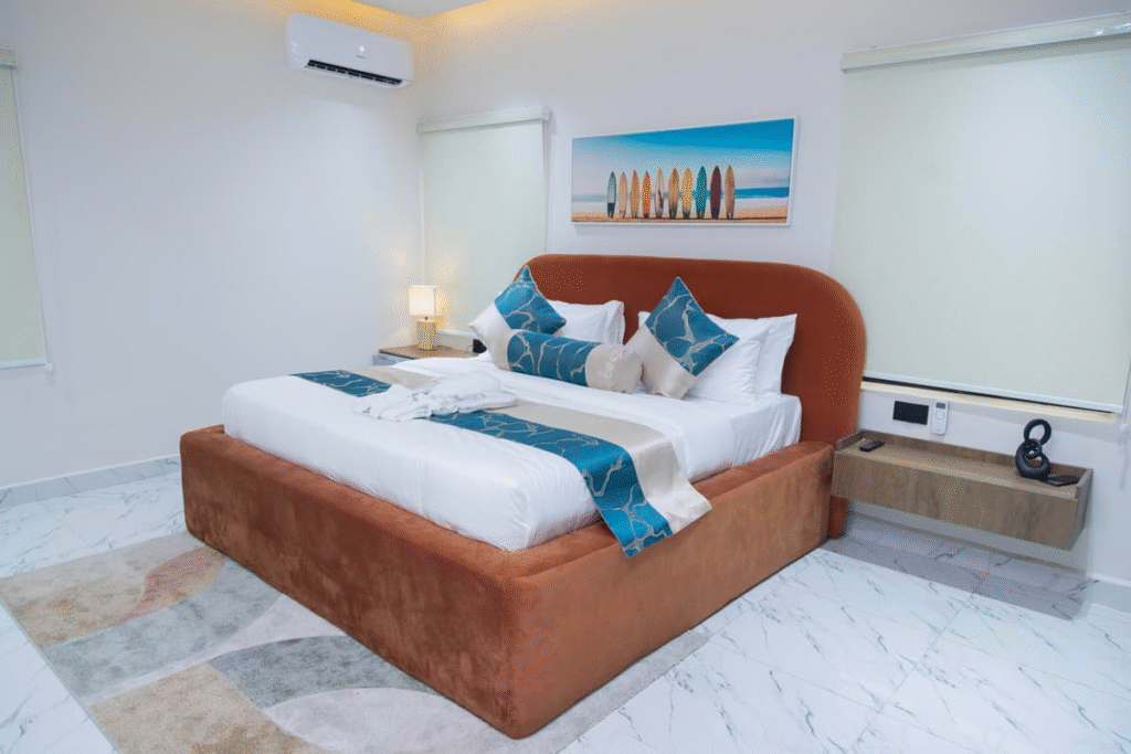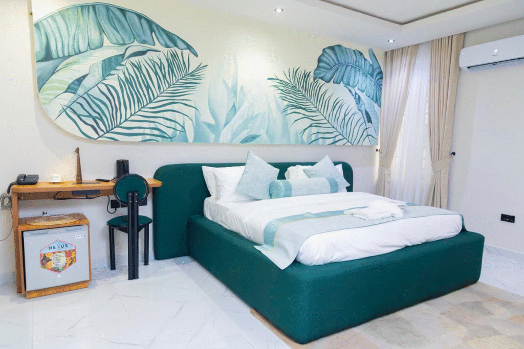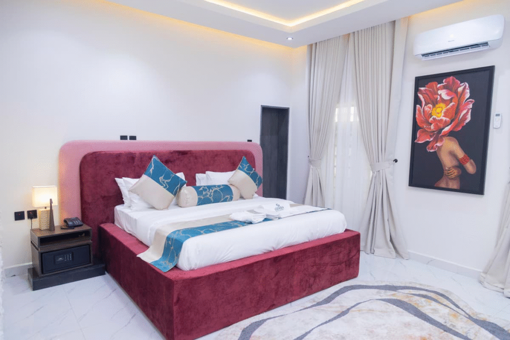 Priced at ₦300,000 per night, the 2-Bedroom Signature Residence is a fully appointed private luxury apartment with two bedrooms, a living room, a kitchen, and what the hotel describes as residential-style comfort.  It includes a private garden, a dining area, and a jacuzzi or bathtub.