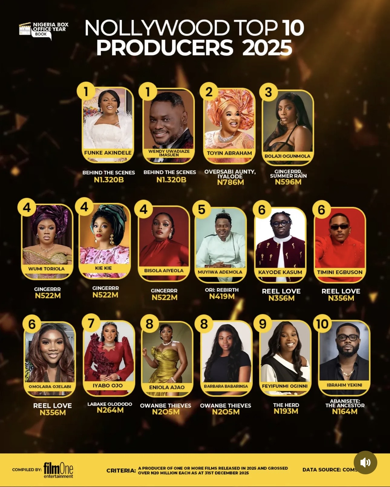 The Nigerian film industry recorded one of its most commercially defining years in 2025, with box office receipts confirming a new generation of producers who combined audience appeal, strong storytelling, and disciplined production strategy. According to data compiled in the Nigeria Box Office Year Book by FilmOne Entertainment, these producers emerged as the highest-grossing figures of the year based on theatrical releases that each surpassed ₦120 million as of December 31, 2025.