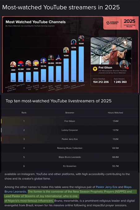 Pastor Jerry Eze has announced a major milestone for his digital ministry, revealing that his YouTube channel, New Season Prophetic Prayers and Declarations (NSPPD), is currently ranked as the third most-watched YouTube channel in the world, surpassing all non-gaming content creators on the platform.