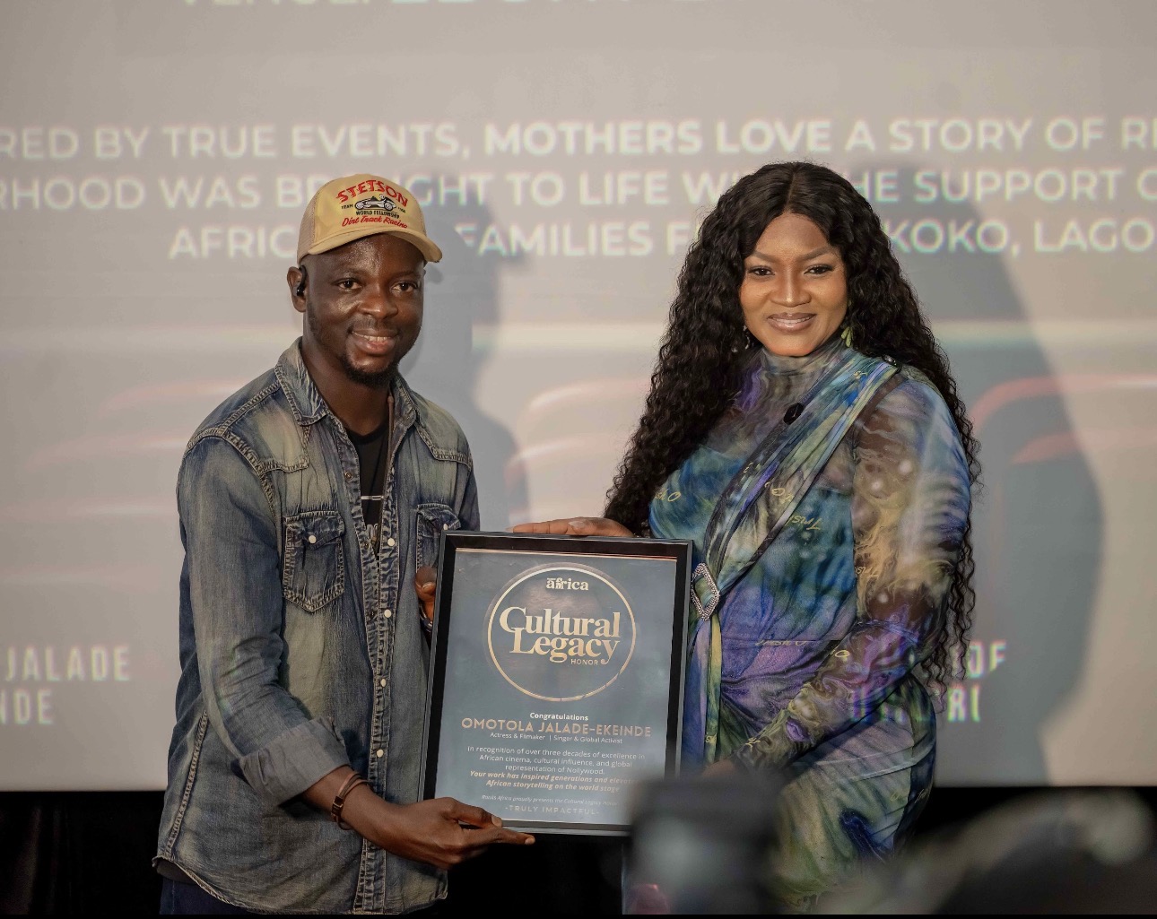 The Cultural Legacy Honor was presented by Adesina Kasali, Lead Consultant and Content Head of Ranks Africa Magazine, who delivered the award with the kind of deliberate warmth that the occasion called for. Standing before the projection screen bearing her own name, Dr. Omotola received the framed citation and held it alongside Kasali as the room acknowledged the moment.