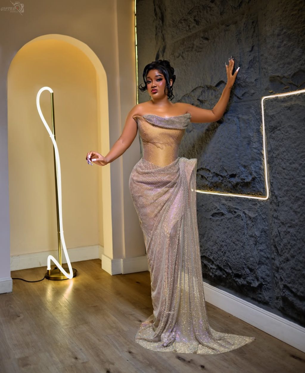 Picture detail: Onome Umukoro appears radiant in a metallic champagne-gold strapless gown with a softly draped neckline. The luminous fabric shimmers beautifully and flows into a floor-length hem that gently pools at the base. The minimalist cut, subtle ruching, and refined styling elevate the look, presenting Onome as the picture of modern elegance and quiet glamour.
