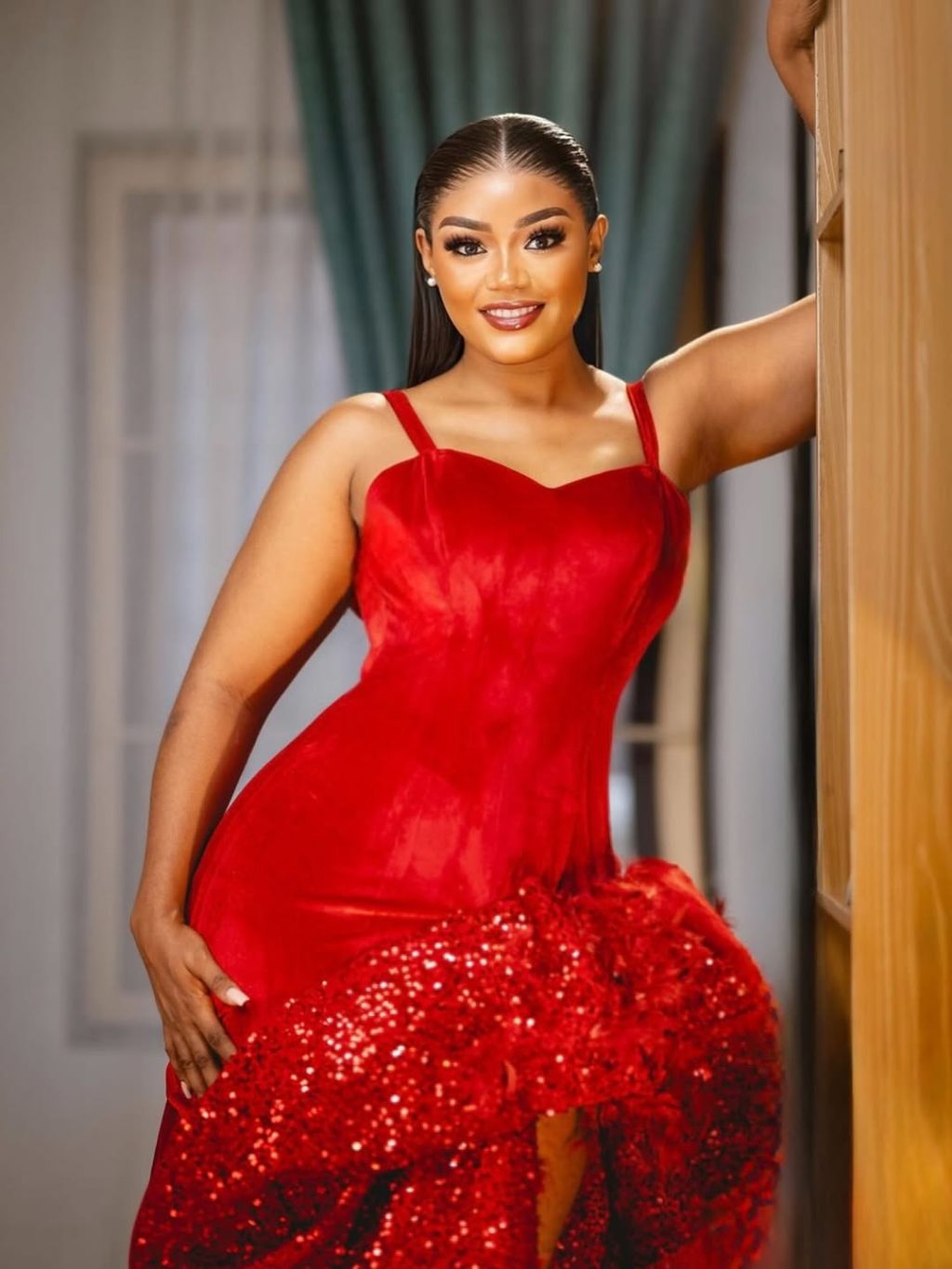 Picture detail: Chinenye Ulaegbu is captured in a striking red dress with a fitted bodice and thin shoulder straps. The fabric blends velvet and sequins, giving the outfit a rich, textured finish. The high-low ruffled skirt is heavily embellished, with an asymmetrical design that highlights her legs. The look is bold, playful, and undeniably eye-catching.