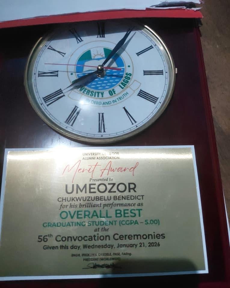 Chukwuzubelu Benedict Umeozo of the Department of Business Administration has been named the Overall Best Graduating Student of the University of Lagos for the 2025 academic session, graduating with a perfect cumulative grade point average of 5.00.